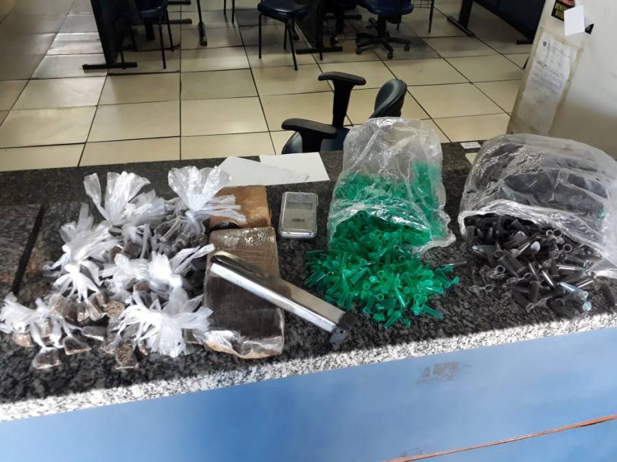 Nas buscas pelos referidos materiais, foram localizados, atrás do muro da residência sob um monte de areia, 165 mariolas de maconha, além de dois tabletes da mesma droga (pesando 1,5 kg); diversos pinos vazios para embalar cocaína; um carregador alongado e uma balança de precisão.