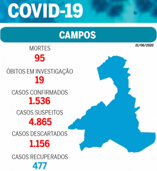 Em novo boletim epidemiológico, divulgado na noite deste domingo (21), a Prefeitura de Campos informou que mais 15 casos de Covid-19 foram registrados em 24 horas, sendo uma nova morte em consequência da doença. Com a atualização dos dados, o município soma 1.536 casos positivos. Destes, 95 pacientes não resistiram e morreram. Além disso, outros 19 óbitos por suspeita da doença são investigados. O boletim deste domingo mostra, ainda, que 4.865 pessoas apresentaram sintomas similares aos do vírus e são acompanhadas por equipes de saúde. Além disso, 1.156 casos foram descartados e 477 pessoas se recuperaram da doença.