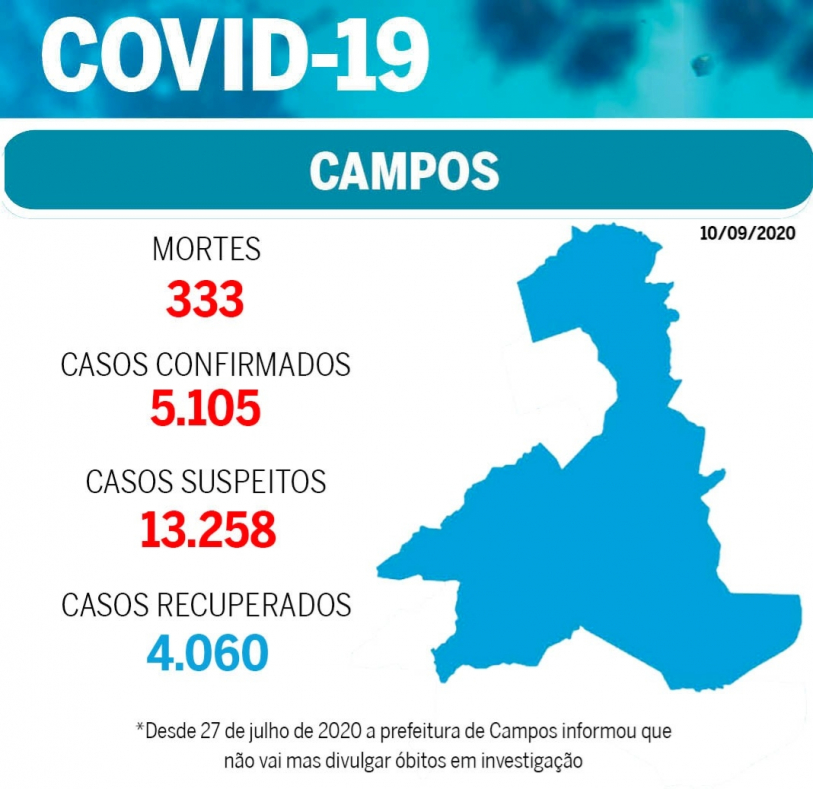 Na noite desta quinta-feira (10), Campos confirmou cinco mortes e 30 novos casos de Covid-19. De acordo com a Prefeitura, o município contabiliza 333 óbitos e 5.105 confirmações da doença. Além disso, 13.258 pessoas apresentaram sintomas suspeitos do vírus e são acompanhadas por equipes de saúde. Até o momento, 4.060 pacientes já se recuperaram da Covid-19.